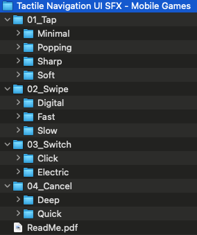 - 400 original SFX (100 Taps, 100 Swipes, 100 Switches, 100 Cancels)
